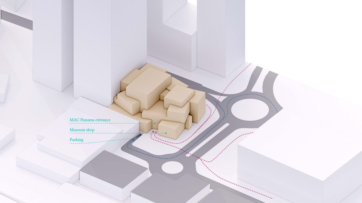 The building for Panama's new Contemporary Museum of Art-MAC Panamá is conceived as a living landscape - an architectural composition of brick cubes, green terraces, and a luminous central atrium that reflects the country’s terrain, climate, and cultural identity. The massing clusters around a triple-height lobby, where filtered natural light enters through a timber-and-glass roof, revealing the project’s core elements: archive, sculptural staircase, and exhibition galleries above. Five types of locally crafted bricks define the façades, celebrating regional craftsmanship while creating subtle variations in texture and color. These are paired with structural timber and expansive glazing, balancing solidity with transparency and warmth. Roof terraces form a “fifth elevation,” finished with vibrant ceramics and planted with native vegetation, contributing to the building’s identity and microclimate. The program is carefully zoned: exhibition spaces occupy the quieter southern edge, while public, commercial, and office functions activate the north and west sides. The main plaza is positioned to enhance urban engagement and frame a gradual spatial experience. Sustainability is embedded in the architecture through passive shading, thermal mass, rainwater collection, and local sourcing. Structurally, the project combines a concrete base and cores, a flexible composite system for the galleries, and a timber atrium -creating a dialogue between permanence and lightness, tradition and innovation.
